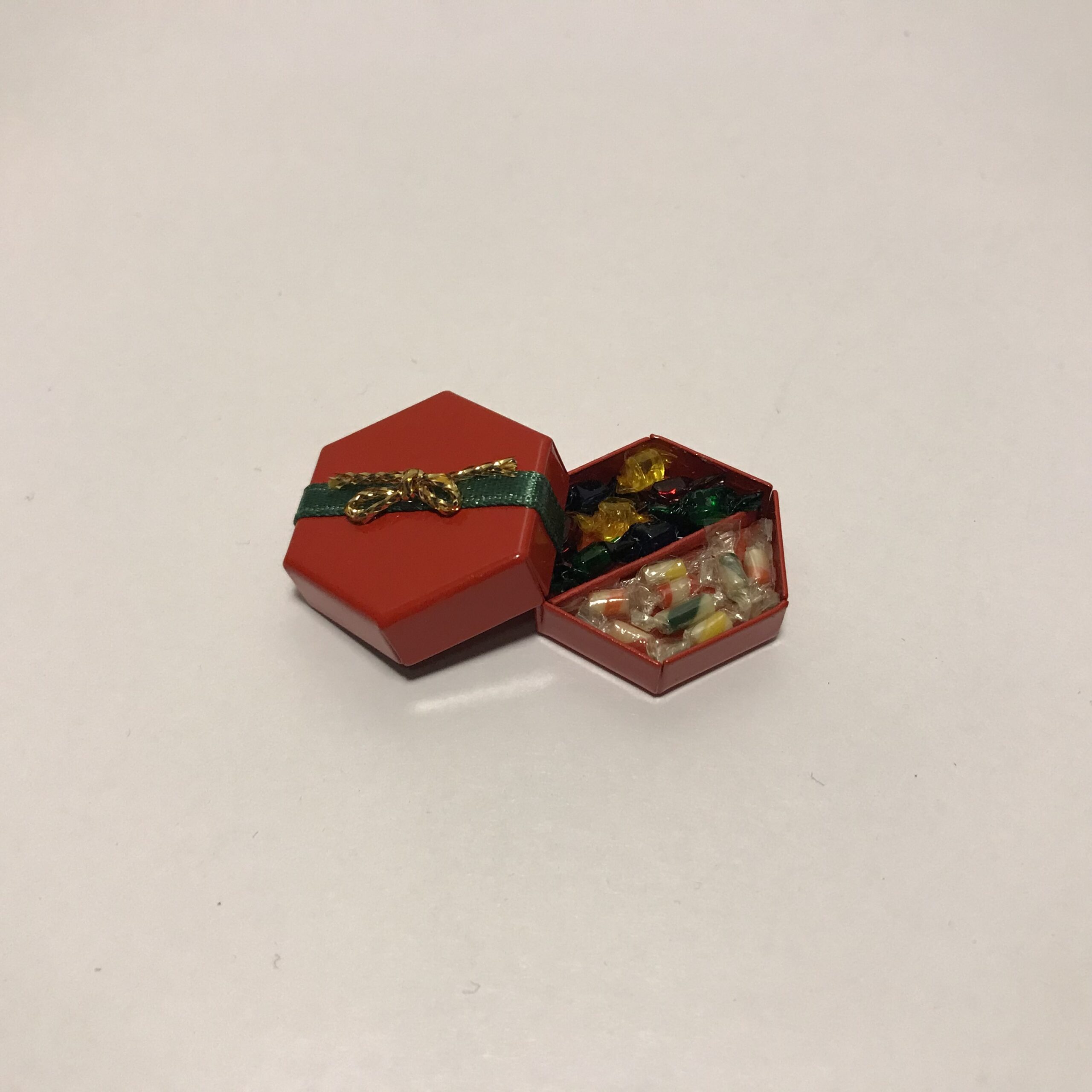 Metalæske med karameller i miniature til dukkehuse, nissedøre og nissehuse.