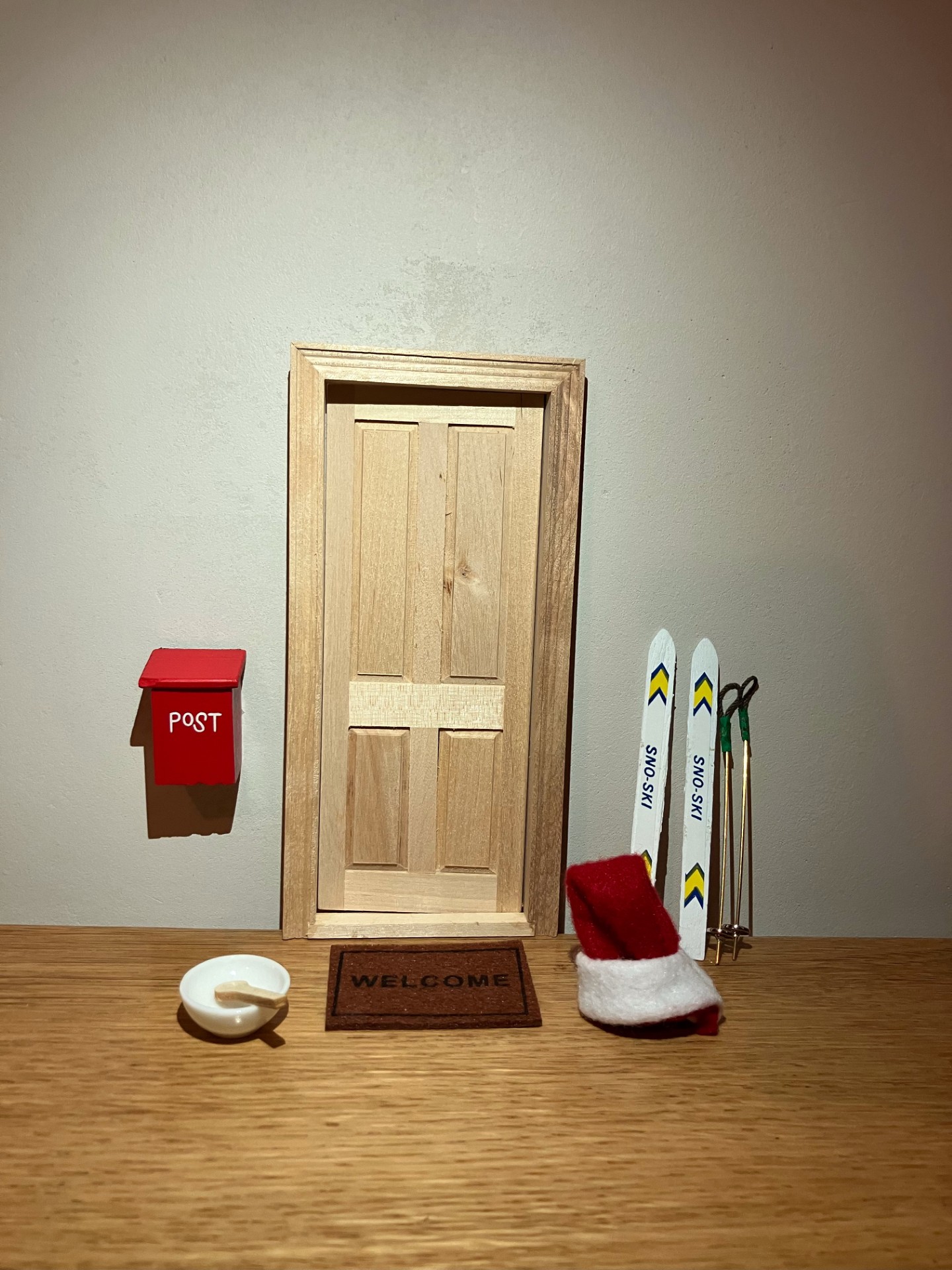 Pakken består af en trædør, et håndtag, en måtte, en postkasse, skål & ske, nissehue og ski.