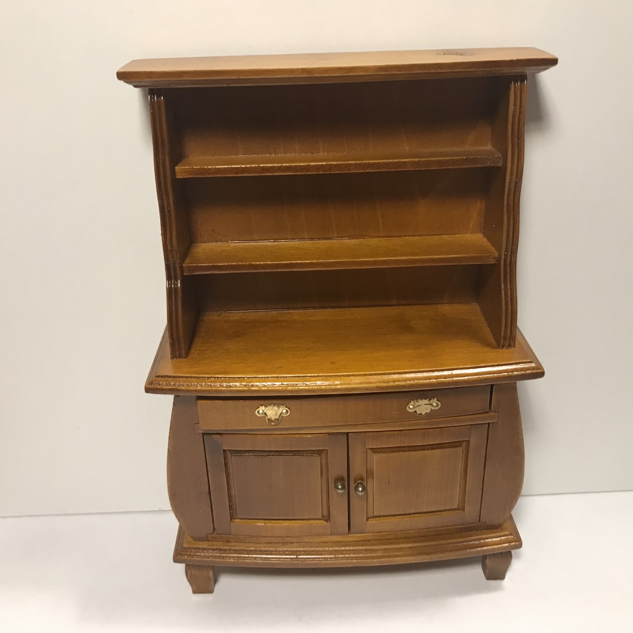 Vitrine i valnød med hylder, en skuffe og to skabslåger.